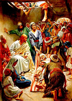 + Contemplemos la fe, la amabilidad de los que echan una mano al enfermo y le llevan ante Jesús, sin desanimarse ante la dificultad de tal hazaña. Es una fe que conmueve el corazón de Jesús y provoca una acogida y prontitud en curarle y perdonarle por su parte. De este modo Jesús ante un mal, ataca a este mal en sus propias raíces, al perdonar. La esencia de la ruina del hombre es el pecado, y Jesús rompe con el pecado por el perdón lo arranca de raíz. La Misericordia es la única capaz de sanar la Miseria del corazón del hombre corrompido por el pecado.