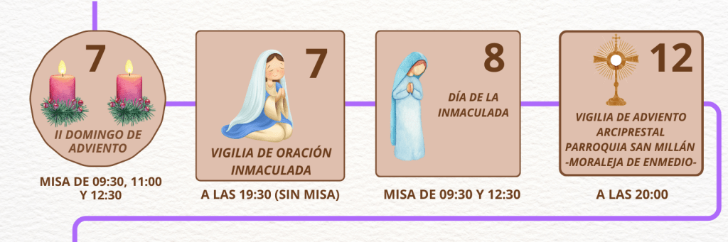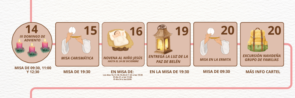 Aquí os dejamos el «calendario parroquial de adviento» donde pueden encontrar diversas celebraciones, tiempos de oración y otras actividades orientadas a alcanzar dicho propósito. A demás tenéis disponible el díptico de adviento con todo el calendario y oraciones para la bendición y el significado de la corona, del árbol de navidad y la bendición del belén.