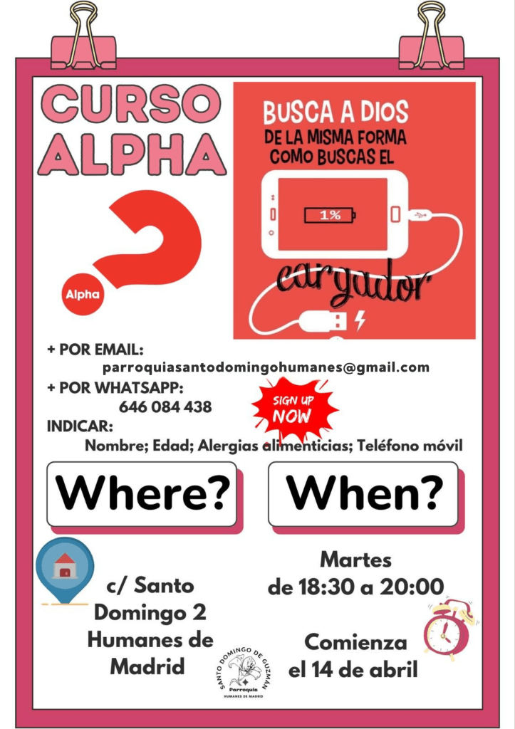 Alpha es una oportunidad de explorar la fe cristiana, de manera relajada y abierta, durante diez semanas, que invitan a la reflexión, con la opción de un retiro de fin de semana. Es discreto, cordial y divertido, y cuenta con el apoyo de las principales denominaciones cristianas. Es casi seguro que hay un curso cerca de donde vives.