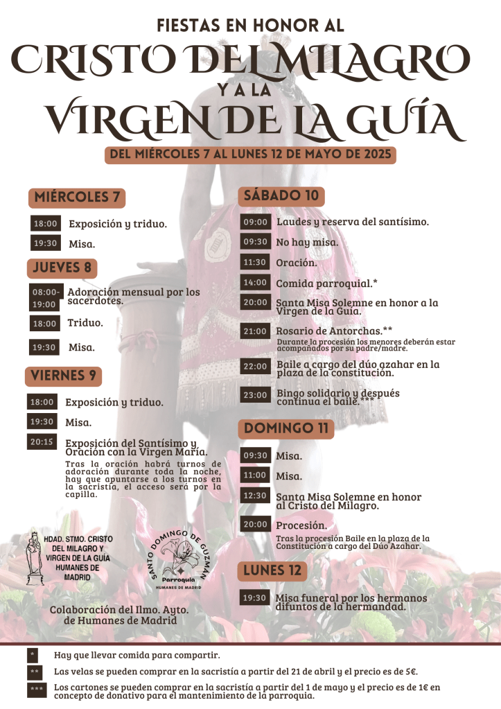 La festividad de nuestra Hermandad del Santísimo Cristo del Milagro y Virgen de la Guía se celebra el segundo fin de semana de mayo.