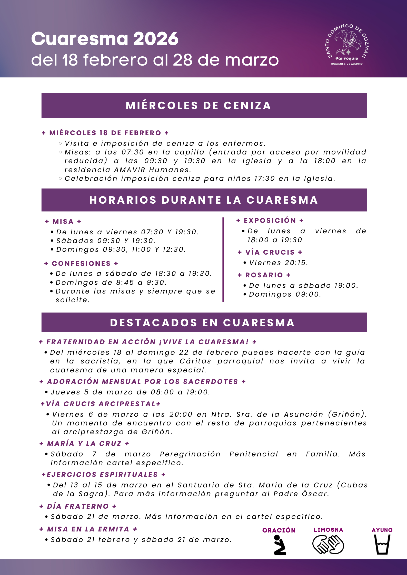 A continuación, tienen el cartel y el folleto con la información básica de lo programado para la cuaresma en la parroquia, y también la guía de fraternidad en acción y el mensaje de cuaresma del Papa León XIV y la carta de nuestro Obispo Ginés. Para más detalles, ver cada semana de la página, la información se actualizará de forma periódica.