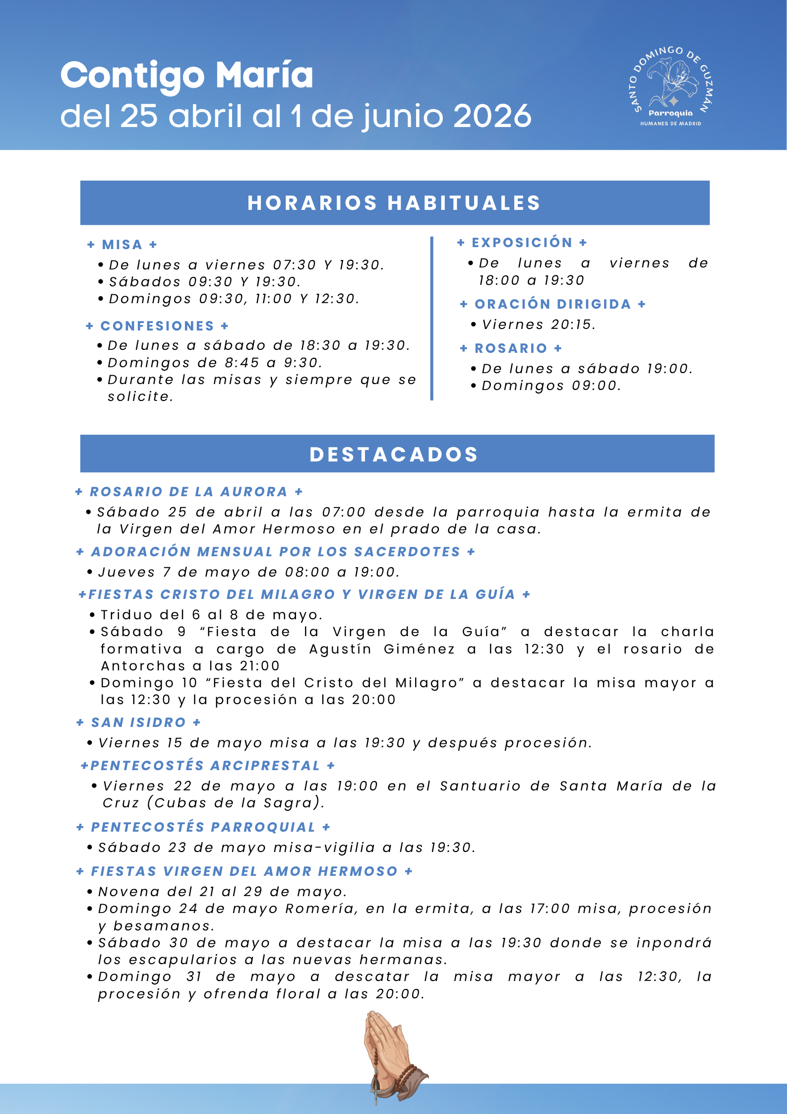 Pulsa para ampliar información. Destacar la novena a la Virgen del Amor Hermoso, el encuentro arciprestal de pentecostés en Cubas y la misa-vigilia de pentecostés en la parroquia.