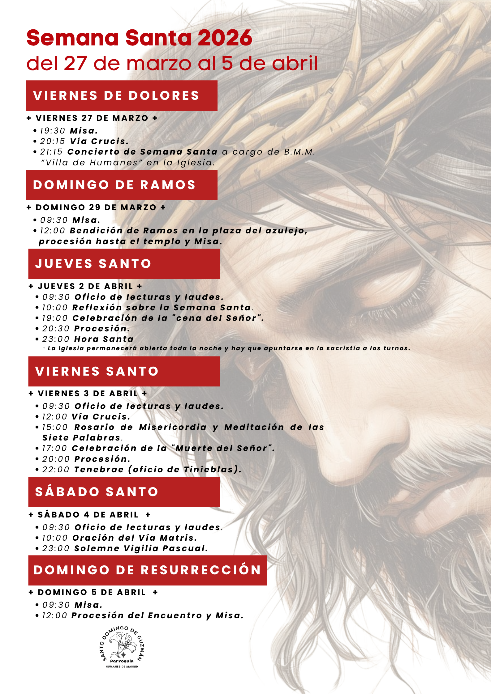 - 21:15 Concierto de Semana Santa a cargo de B.M.M. Villa de Humanes en la Iglesia.