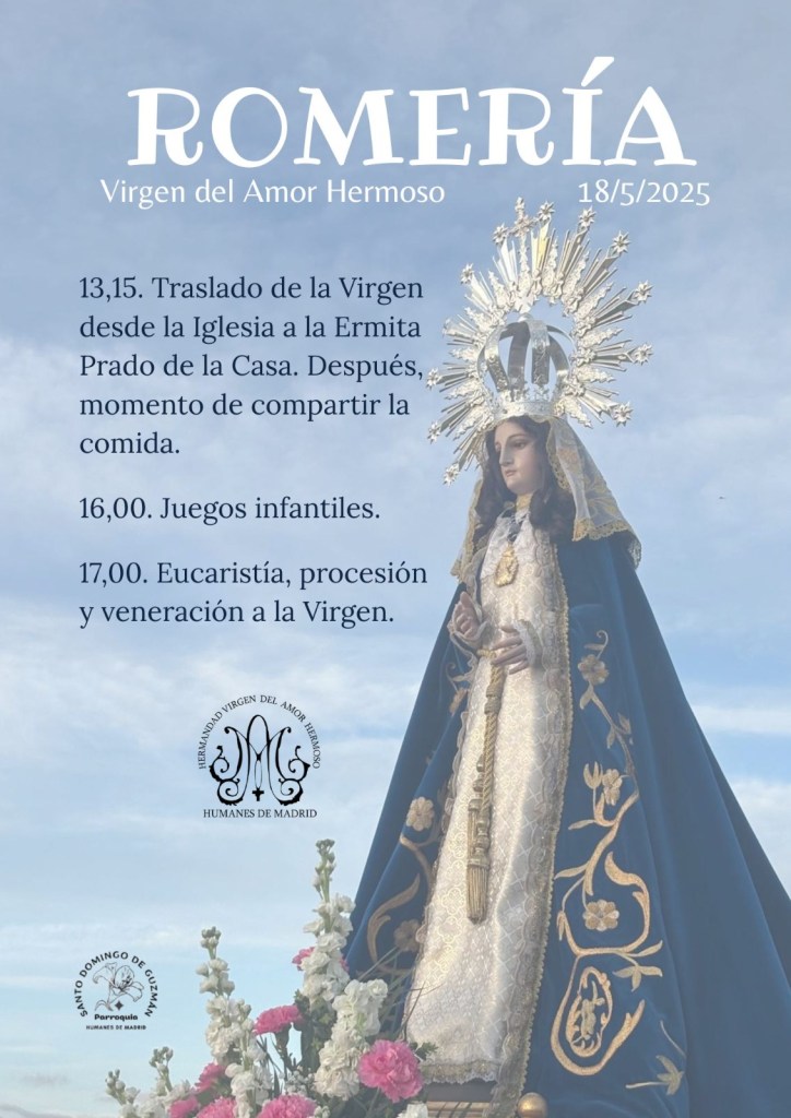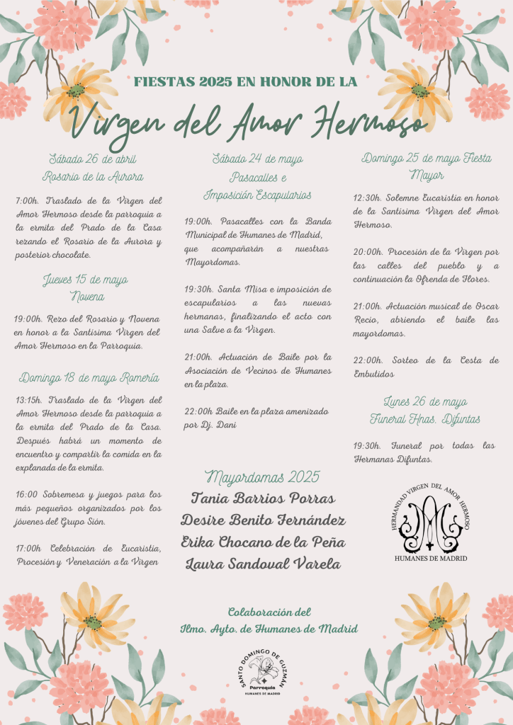 Como devoción a la Virgen surge una institución madrileña: LA CORTE DE MARÍA. Donde se reunían algunas personas a celebrar el mes de MARÍA. A primero de mayo de 1839, encargaron una imagen que hoy se venera en San Gines. Uno de estos coros estaba ya fundado en Humanes en 1847. Se cree que la Hermandad de Humanes es heredera de la de Madrid por algunas de sus similitudes: el escapulario es una reproducción de la primera Virgen de Madrid, las cintas que adornan la imagen en la procesión llevan bordadas la inscripción «CORTE DE MARÍA». Se celebra el 31 de mayo. Se cree que la fiesta fue trasladada al último fin de semana de mayo porque era cuando libraban las mujeres que iban a servir a Madrid. En aquella época era una fiesta solamente de mujeres, les daban descanso a los hombres. En Humanes es conocida como la fiesta de las «mozas», ya que hay un grupo de mujeres jóvenes que se visten de mantilla y peineta, para honrar a nuestra MADRE DEL AMOR HERMOSO, en representación de las mujeres de la Hermandad.